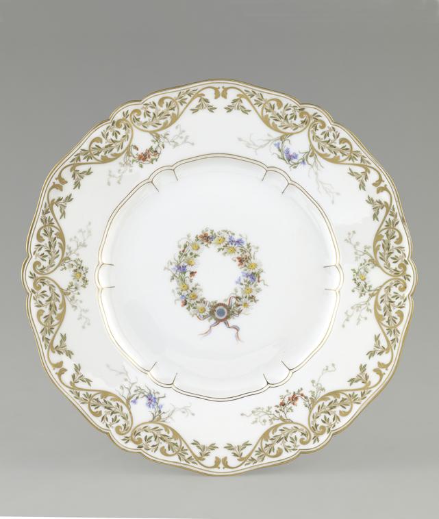 The table is set for 18, using the original Sèvres Pimprenelle china dinner service. This beautiful service was specially commissioned by the state for formal use in the Élysée Palace, the home of French presidents. Produced between 1906 and 1909 by the Manufacture de Sèvres, it was based on drawings by Henri Dujardin-Beaumetz, then undersecretary of state for fine arts, whose art nouveau design symbolises the republic.