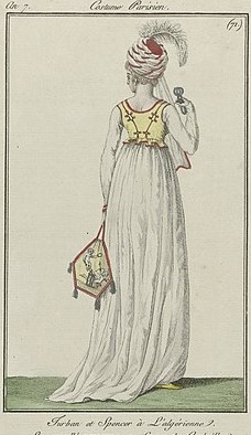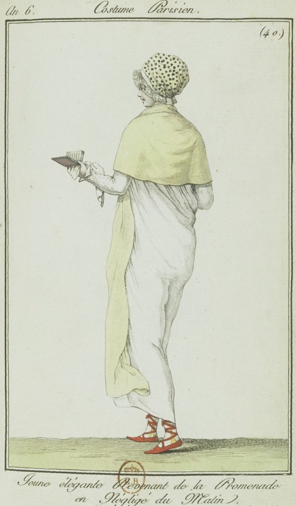 Accessories included hats of all shapes and sizes – black silk caps, velvet with ribbons, turbans with egret feathers, the cornette and the capote. The fashionable carried a tiny handbag, a balantine or réticule, made from lace or silk or even metal, which often hung from the belt.