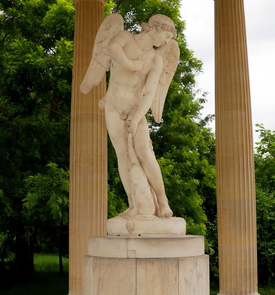 But the statue has a history. The one in Marie Antoinette’s Temple of Love is a copy, fashioned at the same time as the folly was constructed. The original, in 1750, was made for the palace of Versailles and placed in the centre of the Hercules Salon, but was deemed to be far too outrageous, not having the usual simpering or angelic poses one expected of Cupid. the god of Love.