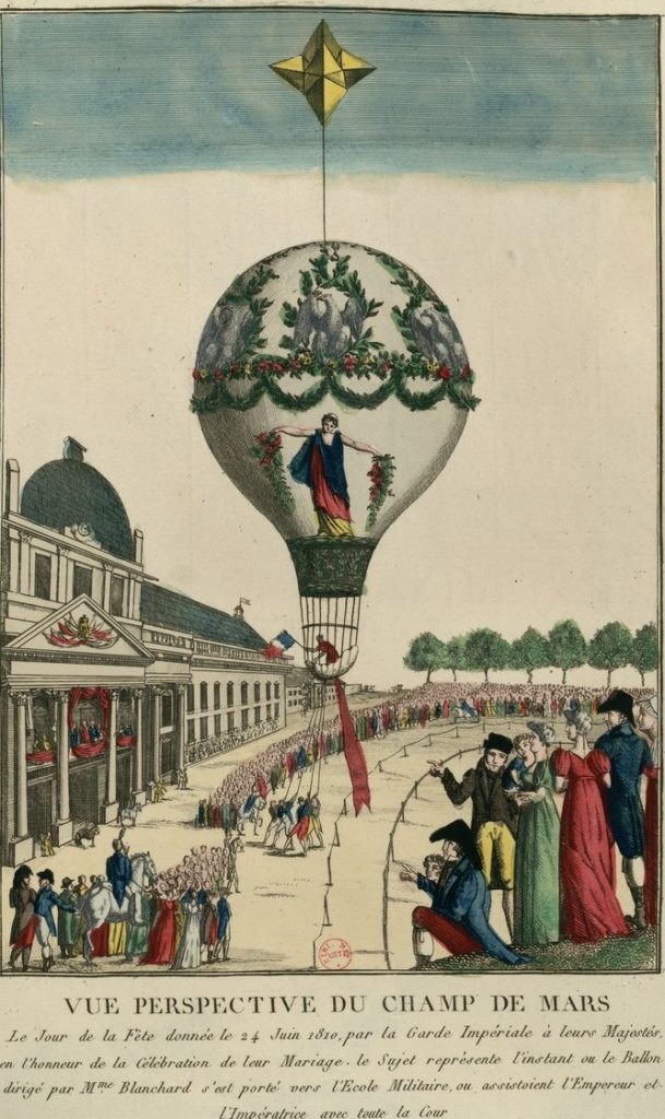 Sophie took to the skies as a duck to the water. Her husband Jean-Pierre was very well known for his crossing of the English Channel in a balloon in 1785, and had flown his balloon at many important state and royal events. He was in fact considered the royal aéronaute to many European monarchies. With Sophie by his side, however, his popularity grew even further. Sophie’s first solo ascension was in Toulouse in 1805, where she floated alone among the clouds for several hours. However, her fortunes were to change somewhat in 1808 when her husband suffered a bout of ‘apoplexy’ during his 66th ascension at the Chateau du Bois in the Netherlands, at a celebration for Louis Bonaparte during his brief sojourn as king of Hollande. Blanchard fell as much as eighteen metres to the ground, was taken back to France, and died a year later from his injuries.