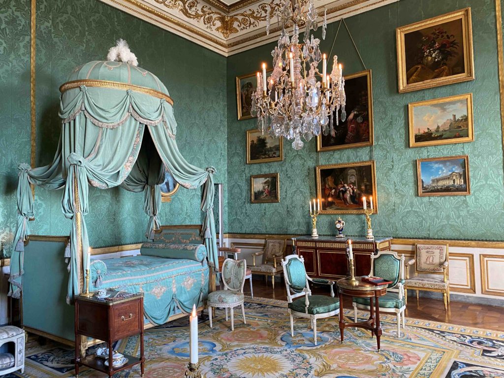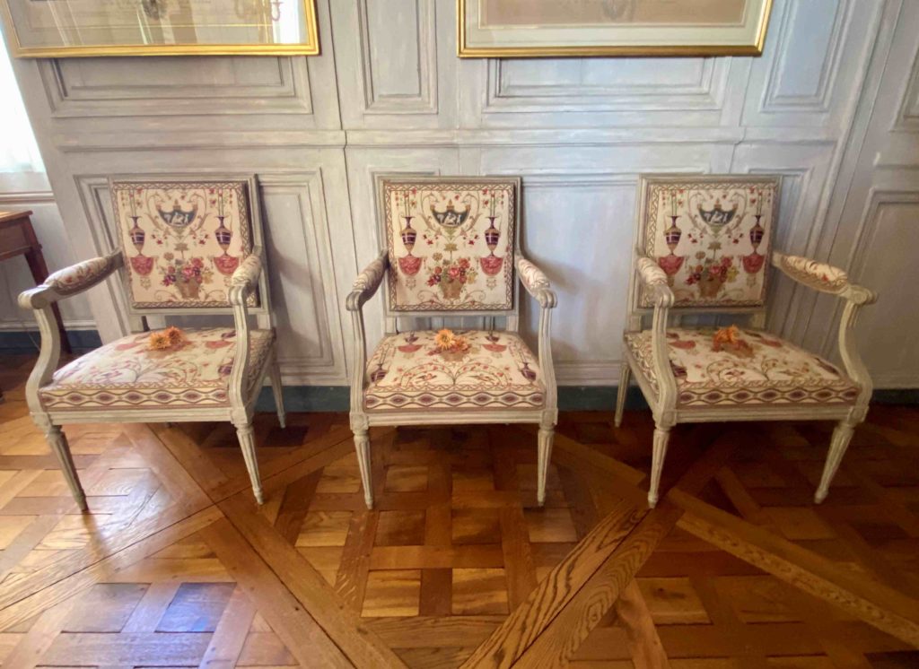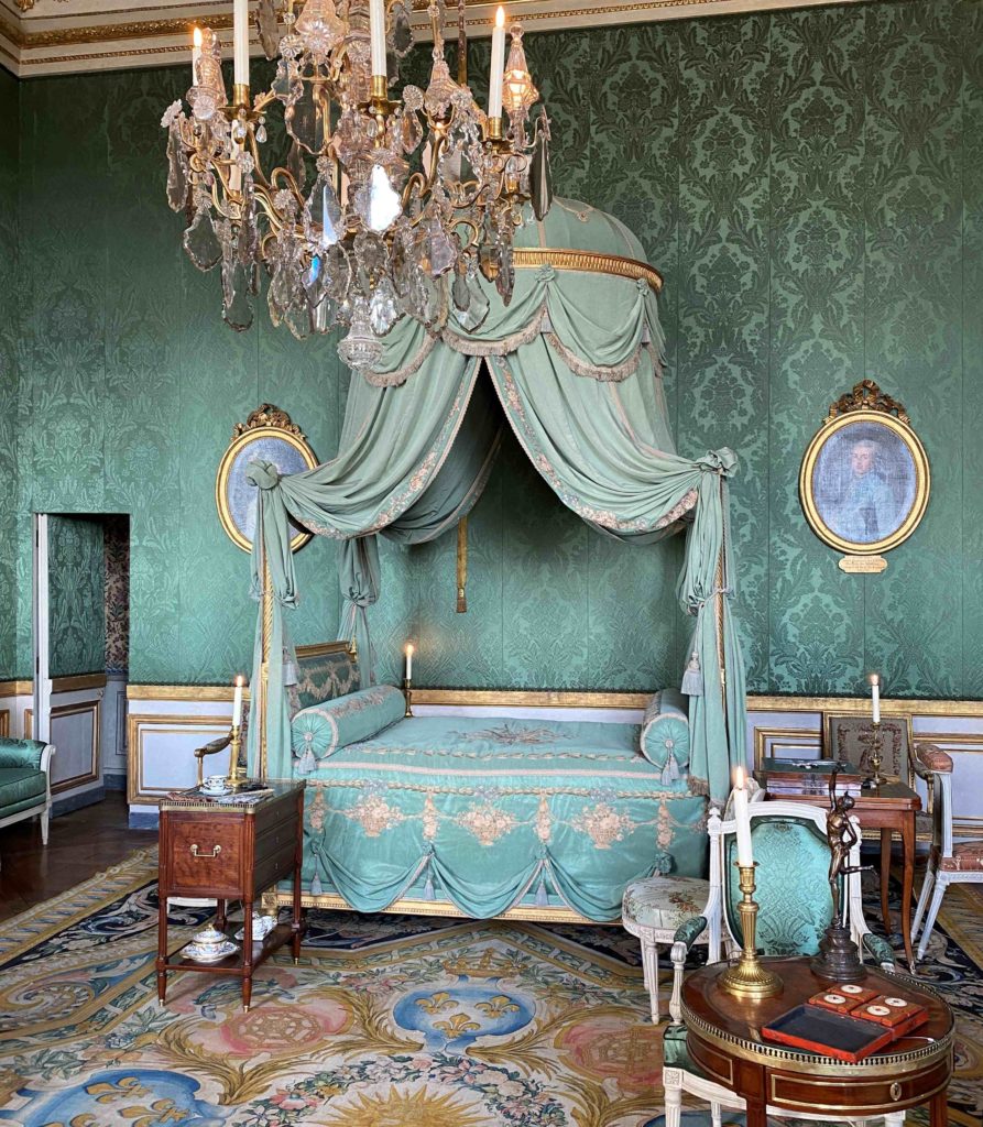 But it was a bedroom all the same, and the objects on display give a glimpse into the world of Madame Thierry. On the bedside table, if you look closely, you can see the treasured fan which was a gift from the queen Marie Antoinette. Perhaps she soothed a crying grandchild in the chair next to the bed, took tea next to the fireplace protected by its silk firescreen, or played a game and gossiped with a close friend whilst sitting at the small table on green damask chairs. Letters were written in the small library which adjoined her room, overlooking the colonnaded terrace, with her armchairs painted white and upholstered in toile de Jouey. It seems like a happy place.