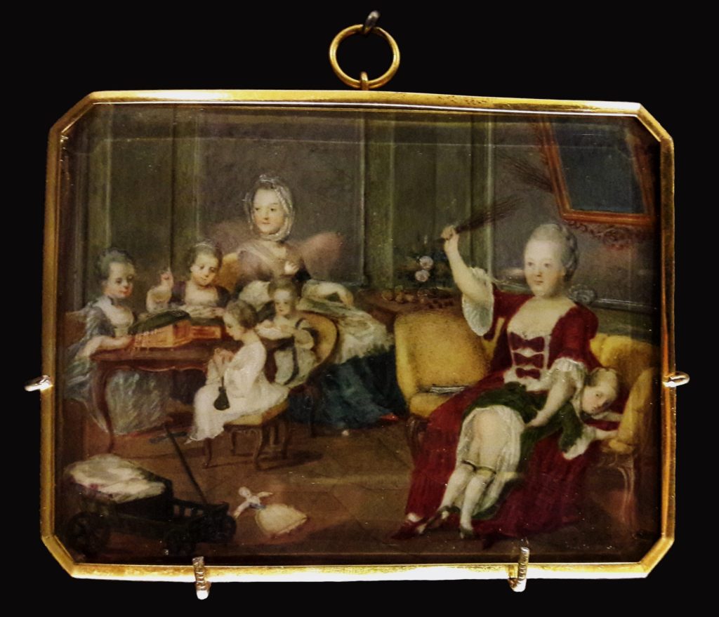 St Nicholas’s Day is traditionally celebrated on 5 or 6 December, and is a similar day to Christmas where children receive presents. This painting, by the Archduchess Maria Christina, shows the imperial family like a normal middle-class family enjoying their cosy home and new gifts. The Emperor, eating his breakfast, wears a robe and slippers, with a cap on his head instead of a wig. The Empress wears a plain dress and the 20 year old Maria Christina, who painted herself in the picture, looks like a governess rather than an archduchess. The Archduke Ferdinand is unsurprisingly rather upset at receiving a birch rod, probably for his naughtiness, while little Max, on the floor with his toys, is playing happily. A smiling Maria Antoine proudly holds out her new doll; at the age of seven she looks much like a doll herself.