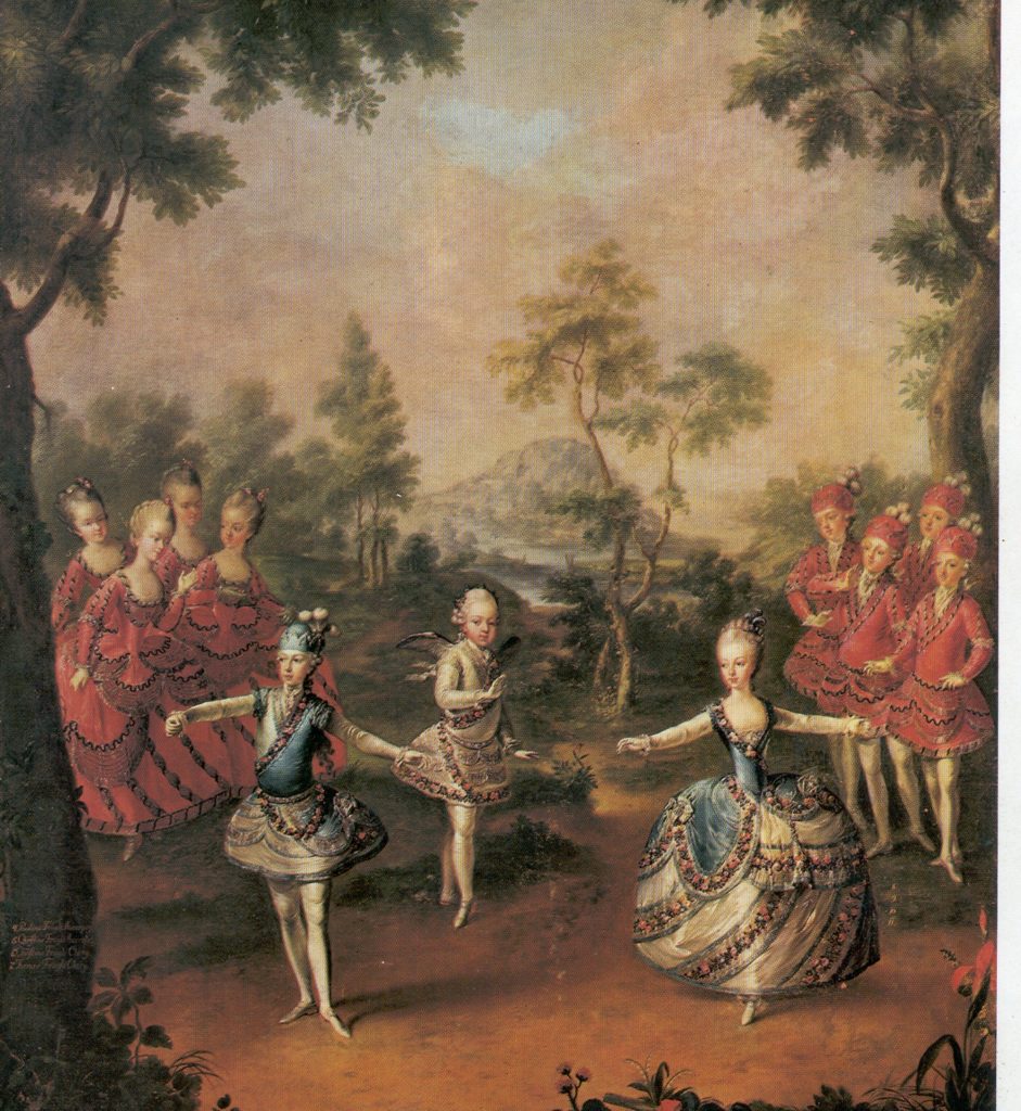 Marie-Antoinette loved music, singing and dancing, playing the harp, harpsichord, flute and piano. Her love of arts and culture never abated throughout her life. She was naturally graceful, and after formal dancing lessons held herself in a distinguished and aristocratic manner. Ballet itself was becoming a popular diversion in the imperial and royal courts of Europe. As part of the magnificent celebrations of the (second) marriage of her brother Joseph to Josepha of Bavaria in 1765, an operetta which had been specially composed for the occasion was performed by and danced to by the imperial children. A ballet was considered the essential accompaniment to an opera, and in the picture above we can see Ferdinand and Marie-Antoinette, shepherd and shepherdess, while Max, the baby of the family, plays Cupid.