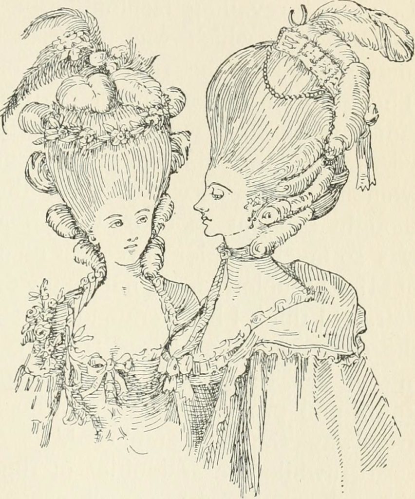 According to Madame Campan, the pouf, the elaborate head-dress, with its gauze, flowers and feathers, arose to such a degree of loftiness, that the women could not find carriages high enough to admit them; and they were often seen either stooping, or holding their heads out at the windows. Others knelt down in order to manage these elevated objects of ridicule with the less danger. Marie-Antoinette did not actually popularise the pouf, its existence at Versailles predated her arrival, but her hair was raised and powdered and puffed like all the other women.